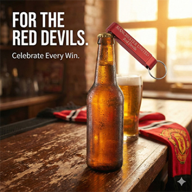 Description: Show your loyalty to Old Trafford wherever you go. This practical multi-tool is crafted from lightweight, durable metal with a vibrant red finish. It functions as both a secure keyring and a sturdy bottle opener, making it an ideal gift for any United supporter.